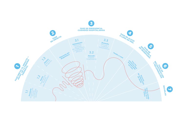 Nos referimos a la fase previa al impacto (antes de la pérdida perinatal), fase de impacto (momento del diagnóstico), fase de emergencia (atención hospitalaria), fase de alivio o luna de miel (regreso a casa), fase de desilusión o inventario (tras los primeros días en casa, momento en el que se hace palpable la realidad de la pérdida), fase de reconstrucción y recuperación (elaboración del duelo) y fase de secuelas (afecciones a nivel físico y/o psicológico que se pueden prolongar en el tiempo).