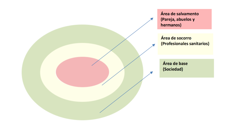 Ante el suceso de la pérdida y siguiendo la analogía con los ciclones, la teoría propuesta establece tres áreas de intervención. La primera es el área de salvamento o zona caliente, relacionada con la familia más cercana. Aquí es donde se encuentra el punto de impacto y donde la desestructuración del sistema es máxima.